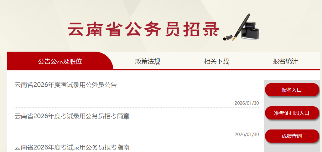 各招录单位的职位名称、招录人数、资格条件、咨询电话等详见《云南省2026年度考试录用公务员招考简章》(以下简称《招考简章》),报考政策规定、报考网络技术和考务安排等事宜详见《云南省2026年度考试录用公务员报考指南》(以下简称《报考指南》)。报考选调生职位的还需具备相应的报考资格条件,详见《报考指南》。《招考简章》、《报考指南》通过云岭先锋网“云南省公务员招录”专栏(以下简称“考录专题网页”,https://ylxf.1237125.cn/TopicWeb/ynskslygwy/index.html)公布。